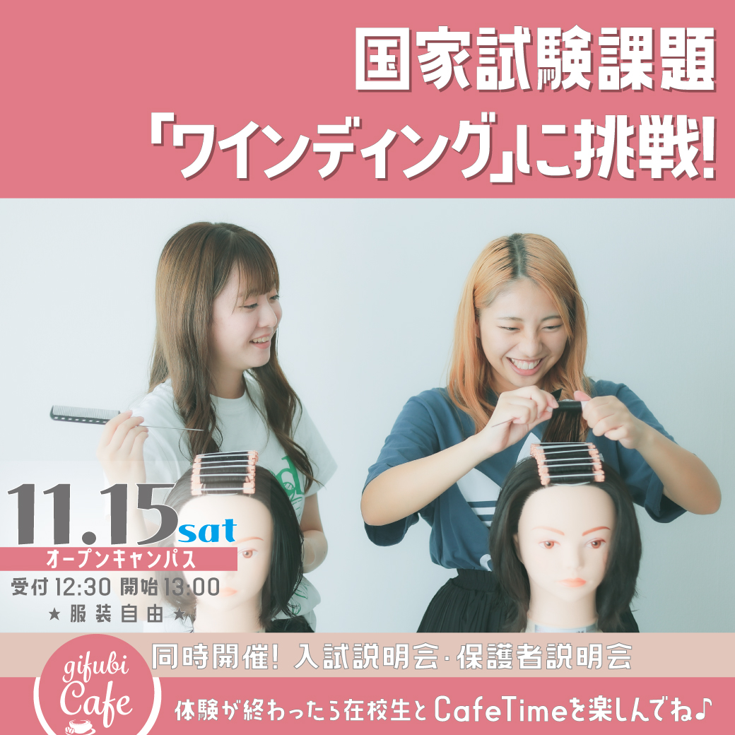 『国試3年連続100%合格率』を誇る本校専門課程の学生がおしえます!初めての方も在校生や先生が丁寧に指導しますので、安心してご参加ください。体験後は「Gifubi cafe」で在校生とたくさんお話たのしんで♪入試説明会・保護者説明会同時開催