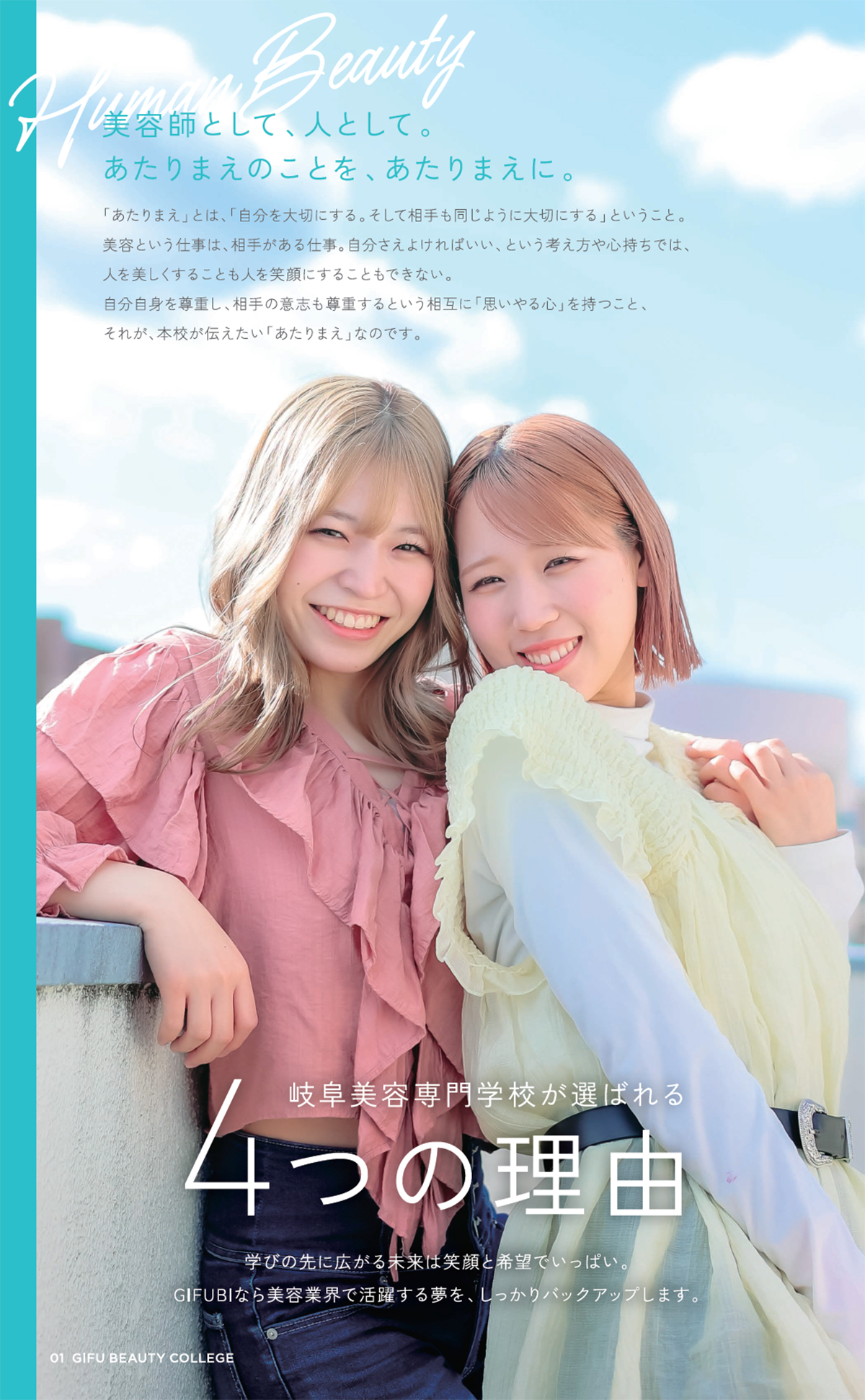 美容の仕事は、「人を美しくすること」で「人を幸せにすること」ができます。それは、外見を流行りのものにすることではありません。キレイになりたいと思う相手の気持ちを受け取り、自分の持つ技術と知識と感性で、キレイになる過程でも相手をワクワクさせ、キレイになれた瞬間の喜びを共有できる素晴らしい仕事です。その仕事を成すためには、美容師国家資格が必要です。基礎的知識と基礎的技術を理解し修得することは、美容師としての確かな信頼と安心のために必要不可欠なものです。人として「あたりまえのことをあたりまえに」。美容の仕事は相手がある仕事です。自分さえ良ければいいという考え方や心持ちでは、相手が喜ぶことも笑顔になることもできません。自分自身も大切に、そして相手のことも同様に大切にする「思いやる心」を持ってください。